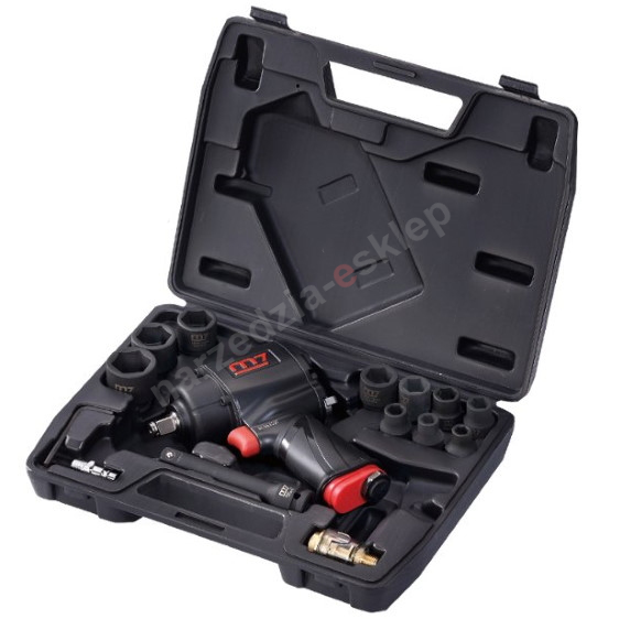 Klucz pneumatyczny M7 NC-4256Q w zestawie z nasadkami. Klucz udarowy NC-4256Q charakteryzuje się bardzo wysokim momentem (1356Nm) przy jednoczesnym zachowaniu kompaktowych wymiarów (jego długość całkowita to zaledwie 141mm).
