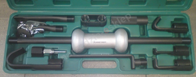 Bezwładnościowy ściągacz blacharski firmy Jonnesway. Wieloelementowy zestaw wraz z ergonomiczną plastikową walizką.