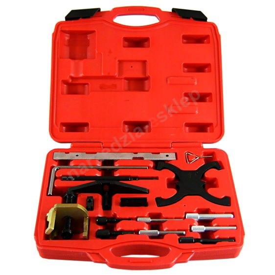 Przyrządy do blokowania wałów rozrządu, wałów korbowych, trzpienie do blokady kół zamachowych, trzpienie do blokady napinaczy oraz ściągacz kół zębatych.