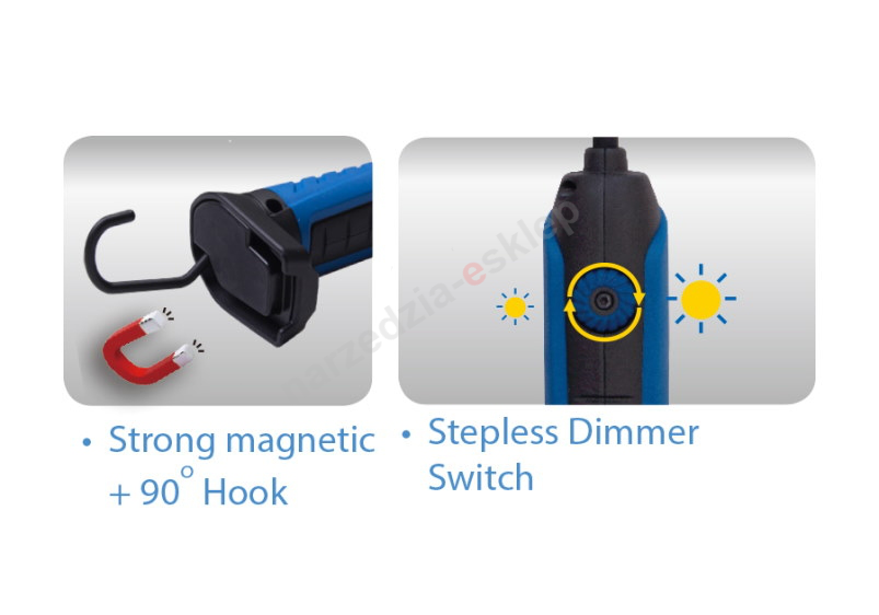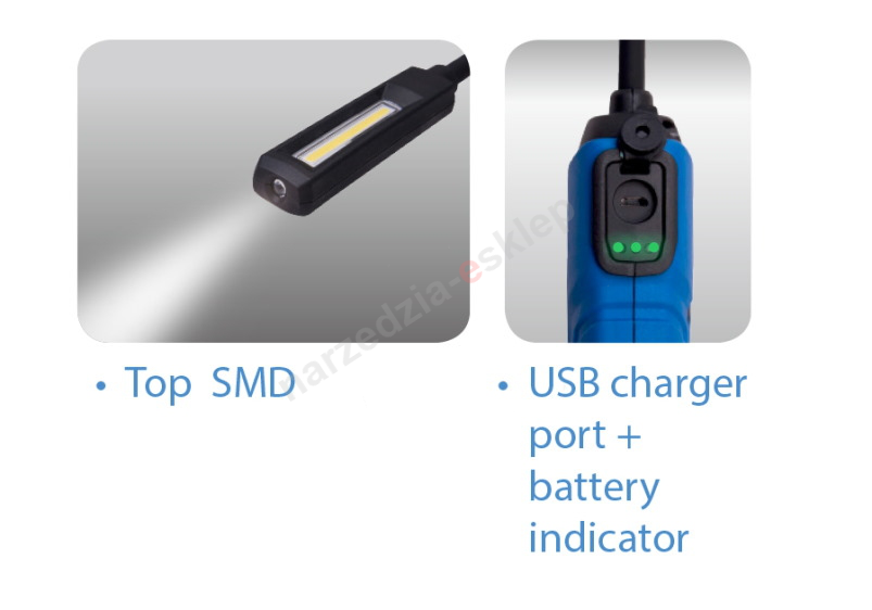 - Elastyczna szyjka, haczyk 90°, podstawa magnetyczna, wskaźnik naładowania baterii