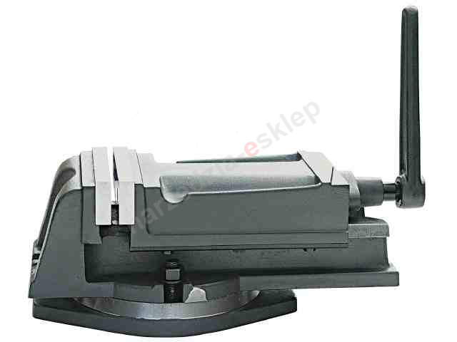 Imadło obrotowe maszynowe żeliwne, z gładkimi hartowanymi i szlifowanymi klockami szczękowymi z wąskimi rowkami. Śruba osłonięta. Dostarczane z obrotową płytą podstawy, z podziałką 360°.