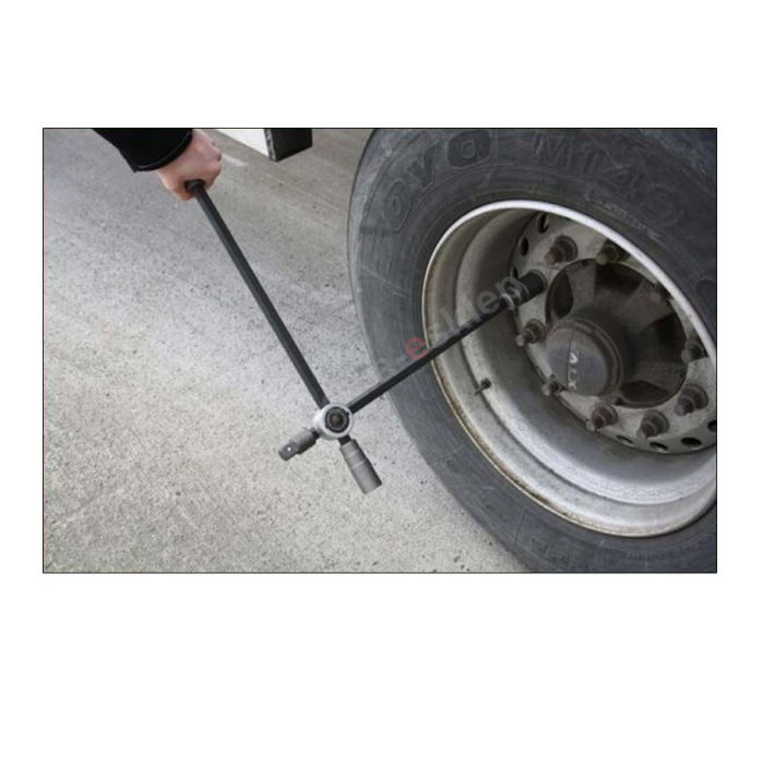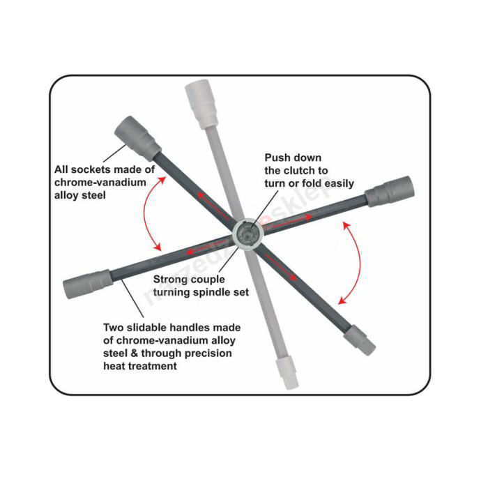 Składany klucz krzyżakowy z przegubem ślizgowym przeznaczony do nisko położonych nakrętek kół lub prac, gdzie konieczne jest zwiększenie dźwigni: