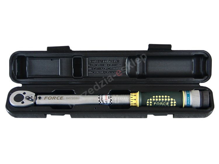 Klucz dynamometryczny Force 6473380 w rozmiarze 3/8\" posiada zakres regulacji siły dokręcania od 20 do 110 Nm. Narzędzie doskonale sprawdza się wszędzie tam, gdzie występuje potrzeba precyzyjnego dokręcenia śrub konkretnym momentem obrotowym. Klucze dynamometryczne Force to gwarancja wysokiej jakości w przystępnej cenie.