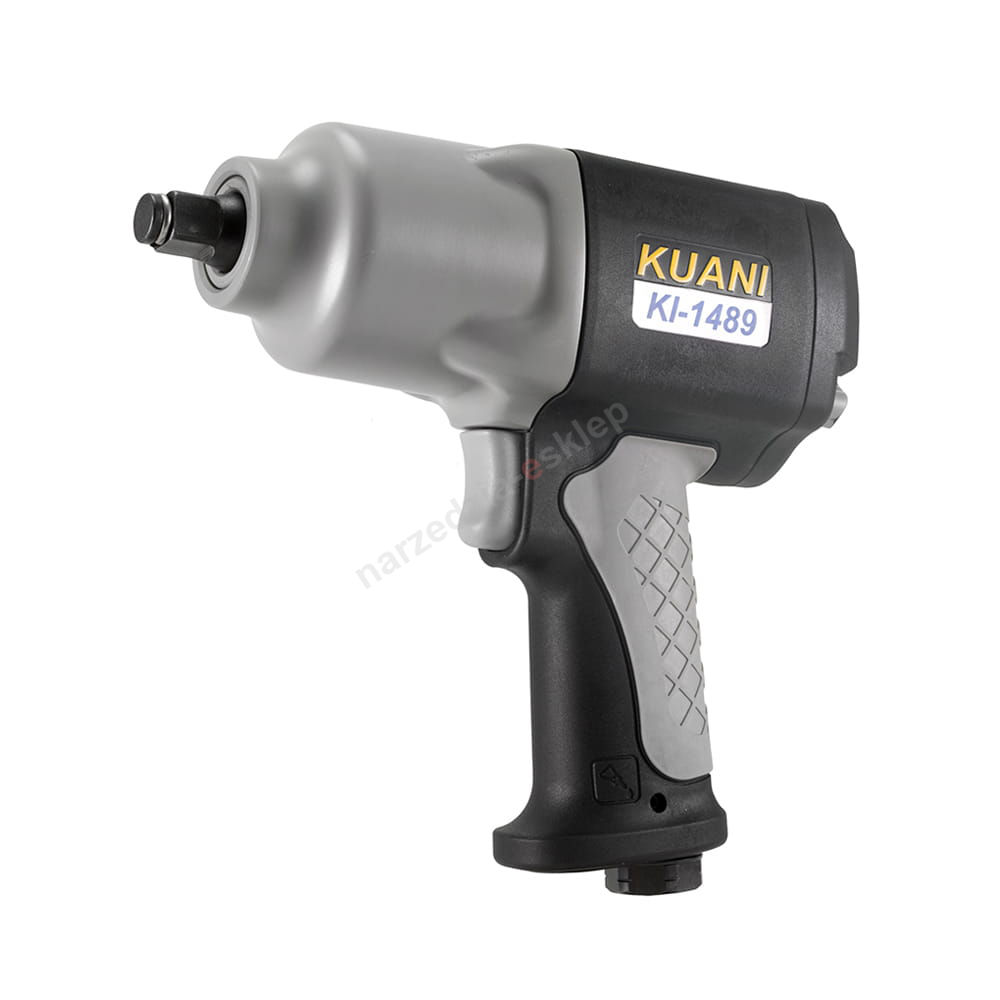 Profesjonalny klucz pneumatyczny udarowy 1/2" Kuani KI-1489 o momencie maksymalnym 1356 Nm. Wyważony i ergonomiczny uchwyt idealnie pasuje do ręki i zmniejsza ryzyko urazu nadgarstka podczas długotrwałej pracy. Model KI-1489 posiada płynną regulację obrotów oraz trzy pozycje ustawienia mocy w przód i jedną wstecz. Wyposażony jest w sprzęgło typu Twin Hammer. Wylot umieszczony w uchwycie odprowadza powietrze nie powodując zapylenia stanowiska pracy.