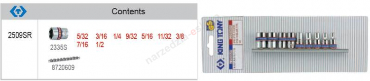 Zawartość: 5/32", 3/16", 1/4", 9/32", 5/16", 11/32", 3/8", 7/16", 1/2"