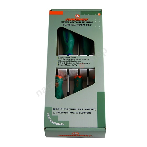 Zestaw profesjonalnych wkrętaków z rękojeścią antypoślizgową firmy Jonnesway D71C105S. Wkrętaki D71 wykonane są z wysokogatunkowej stali chromowo-molibdenowo-wanadowej.