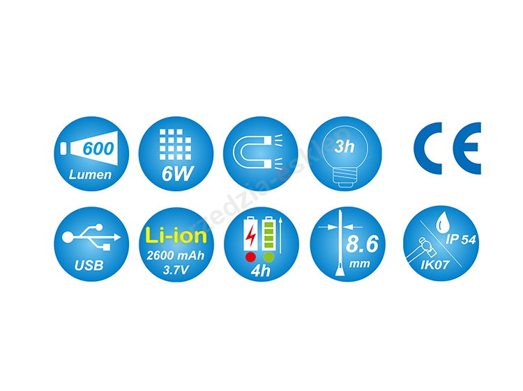 - czas pracy: niski poziom światła 6 godz., wysoki poziom światła 3 godz., latarka 7 godz.