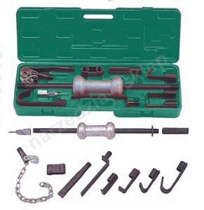 Bezwładnościowy ściągacz blacharski firmy Jonnesway. Wieloelementowy zestaw wraz z ergonomiczną plastikową walizką.