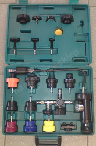 Kompleksowy zestaw firmy Jonnesway służy do testowania szczelności układu chłodzenia w wielu modelach samochodów. Ciśnienie w przyrządzie może być wytworzone dzięki powietrzu dostarczonemu przez specjalne przyłącze z ręcznej pompy lub innego źródła sprzężonego powietrza. Wygodne przechowywanie i transport dzięki plastikowej walizce wchodzącej w skład zestawu.