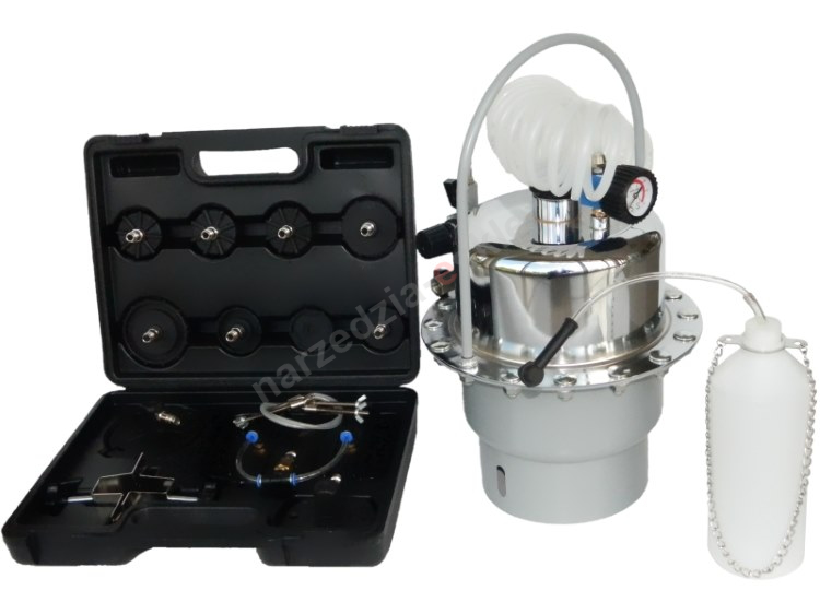 Urządzenie jest przeznaczone do opróżniania, odpowietrzania i wymiany płynu w układach hamulcowych i sprzęgłach hydraulicznych. Zapewnia możliwość wymiany płynu przez jedną osobę w ciągu kilku minut, bez ryzyka zapowietrzenia układu. Dodatkowo urządzenie posiada specjalny zbiornik wysokiego ciśnienia, który można wcześniej napełnić sprężonym powietrzem. Dzięki temu urządzenie może pracować bez konieczności stałego zasilania sprężonym powietrzem. Zestaw wyposażony jest w zestaw korków do najpopularniejszych marek samochodów.