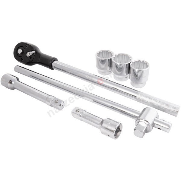 14 – elementowy zestaw kluczy nasadowych 12-kątnych z grzechotką 3/4" w zakresie rozmiarów 22-50 mm.