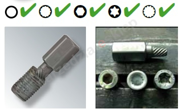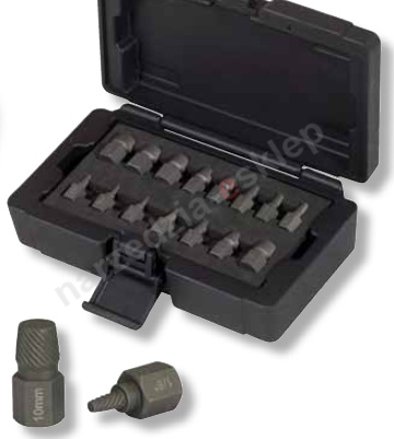 Bardzo krótkie wykonanie (długość = 36 mm) z napędem 6-kątnym SW 13, zajmuje mało miejsca, spirala zbiegająca się lekko stożkowato. Urządzenie rozwiązujące problemy związane z wykręcaniem śrub o zaokrąglonym profilu wewnętrznym np. śruby imbusowe z otworem sześciokątnym, wielozębowe, RIBEŽ, TORXŽ etc. Do użycia w przypadku otworu pod gwint, jak również do zerwanych śrub i sworzni stojących. Odkręcacze od 1/8“-1/4“ są wyposażone w kołnierz oporowy, dzięki czemu zapewniony jest efekt kontrowania i ogranicza się rozchylanie.